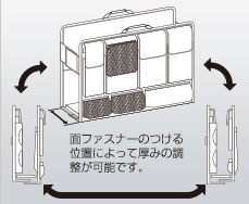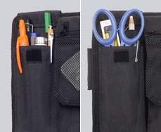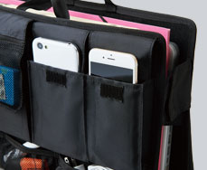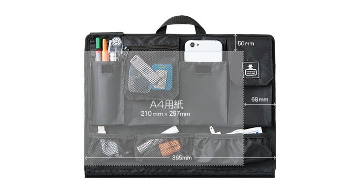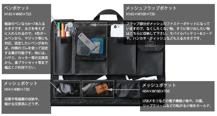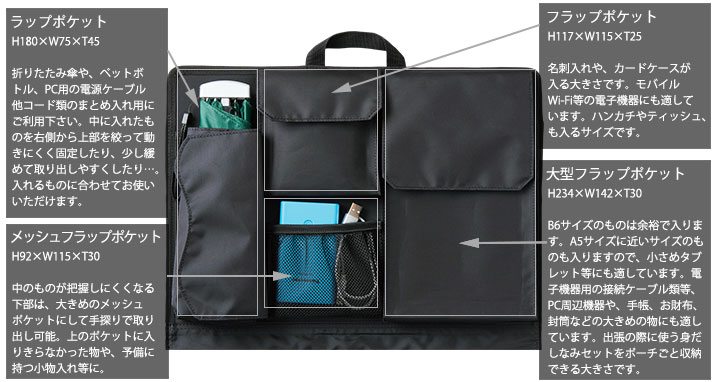 2枚のパネルを本体底部のテープファスナーで分離し組み替える事が可能です。ポケットの位置の面の組み替えで4通りの使い方ができます。ご自身の使い方に合わせて幅(カバンの厚さ方向)を調節したり、パネル1枚だけでご利用する事も可能です。ビジネスカバンはもちろんの事、横型トートバッグ、ビジネスリュックタイプの方にもお使い頂けます。