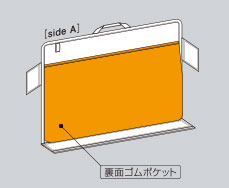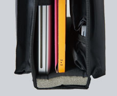 本体の底部にはパソコンの衝撃吸収を狙いとして、カット可能で幅の変更できるトリコット貼りのスポンジパッドをご用意しております。また、パネル面の裏側2面には柔らかなトリコット生地を貼り、大切なパソコンに傷を付けにくくするよう配慮をいたしております。sideAの裏側のポケットは、A4クリアファイルや新聞、雑誌なども入る大きめポケットです。