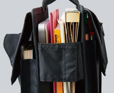 細身のペンなどは内側のゴムでのホールドが可能です。ペンケースのようなポケットになった事で、ハサミ/カッター/定規など、文房具入れとしても自由にご利用が可能となっております。