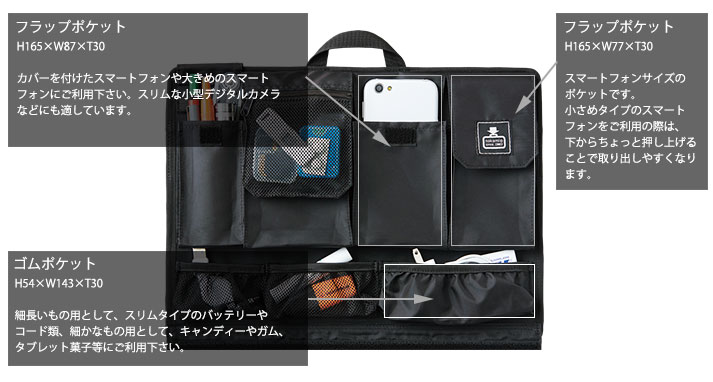 スマートフォンの種類(幅の違い)に合わせ、2サイズのフラップポケットをご用意致しました。大きめタイプは、カバー付きで厚みがあるものにも対応し、モバイルWi-Fiや、バッテリー入れにもご利用可能です。