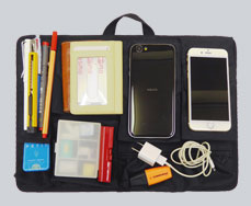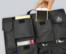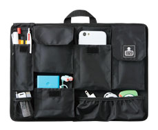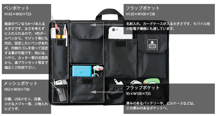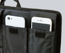 大小9個のポケットは、スマートフォンや、モバイル機器の様々な付属品、ビジネス小物をはじめ、普段の生活小物(名刺、定期、鍵、薬、リップ、文房具等)まで様々なサイズのものを想定しています。厚みがあるので、名刺入れとパスケースをまとめて入れたり、スマートフォン2台をまとめて入れたりする事も可能です。