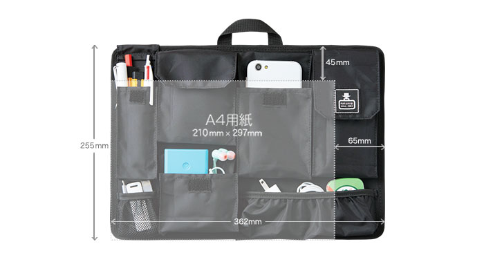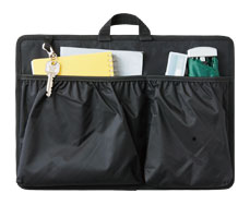 本品上部の持ち手を使って、簡単に移動可能です。オンビジネスからオフタイムまで、ビジネスバッグからトートまで「カバンの中身B4Ver.7.0」®をお使いになると、まるで服を着替えるように簡単にカバンを替えることができるようになります。それと同時に、小物を移し替える手間も省け、『忘れ物防止』にも役立ちます。
