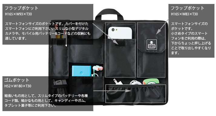 またスマホ時代に合わせ、2サイズのスマホ用ポケットと、付随する小物や、