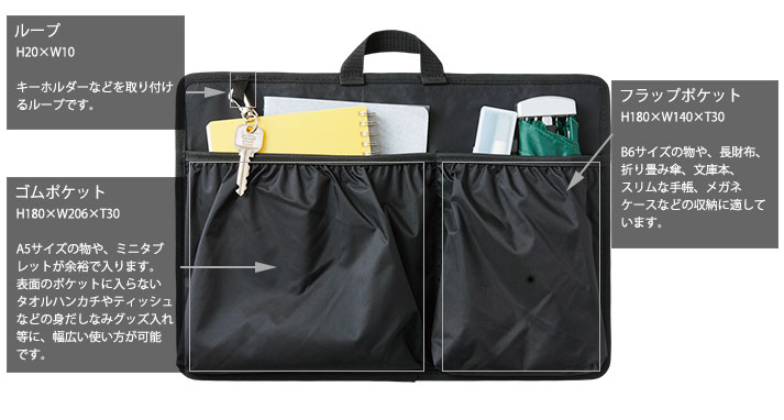 表面は汎用性のある大中小の7個のポケット。裏面には、表面に収まらない物を入れられるよう、使い勝手のよい、2個のゴム口ポケットとしました。A5サイズ、B6サイズ、ミニタブレット、長財布、傘、厚みが出るハンドタオルなどにも。sideBの上部左には、キーホルダーなどを取りつけられるループを付けています。