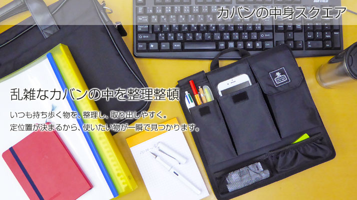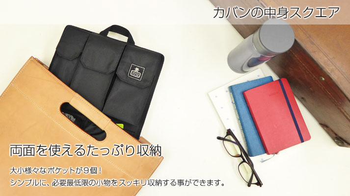 カバンの隙間に必要な小物だけ入れる小型商品として、大小のポケットを両面収納でまとめました。小さいながらも、収納力がアップし、B4サイズのカバンからA4サイズのカバン、またリュックやトートバッグでも幅広く使える万能商品です。