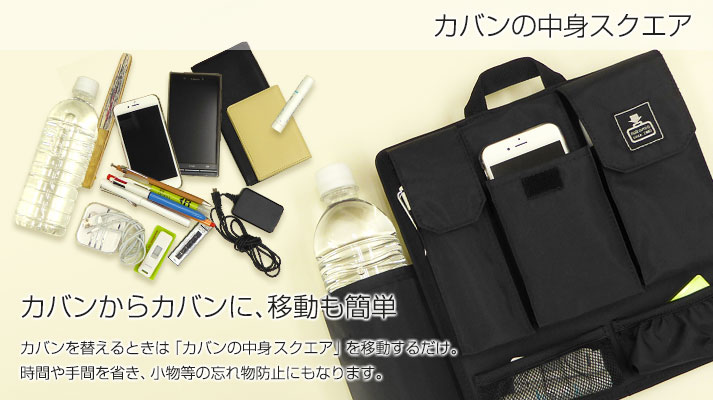 本品上部の持ち手を使って、簡単に移動可能です。オンビジネスからオフタイムまで、ビジネスバッグからトート、リュックまで「カバンの中身スクエア」®をお使いになると、まるで服を着替えるように簡単にカバンを替えることができるようになります。
